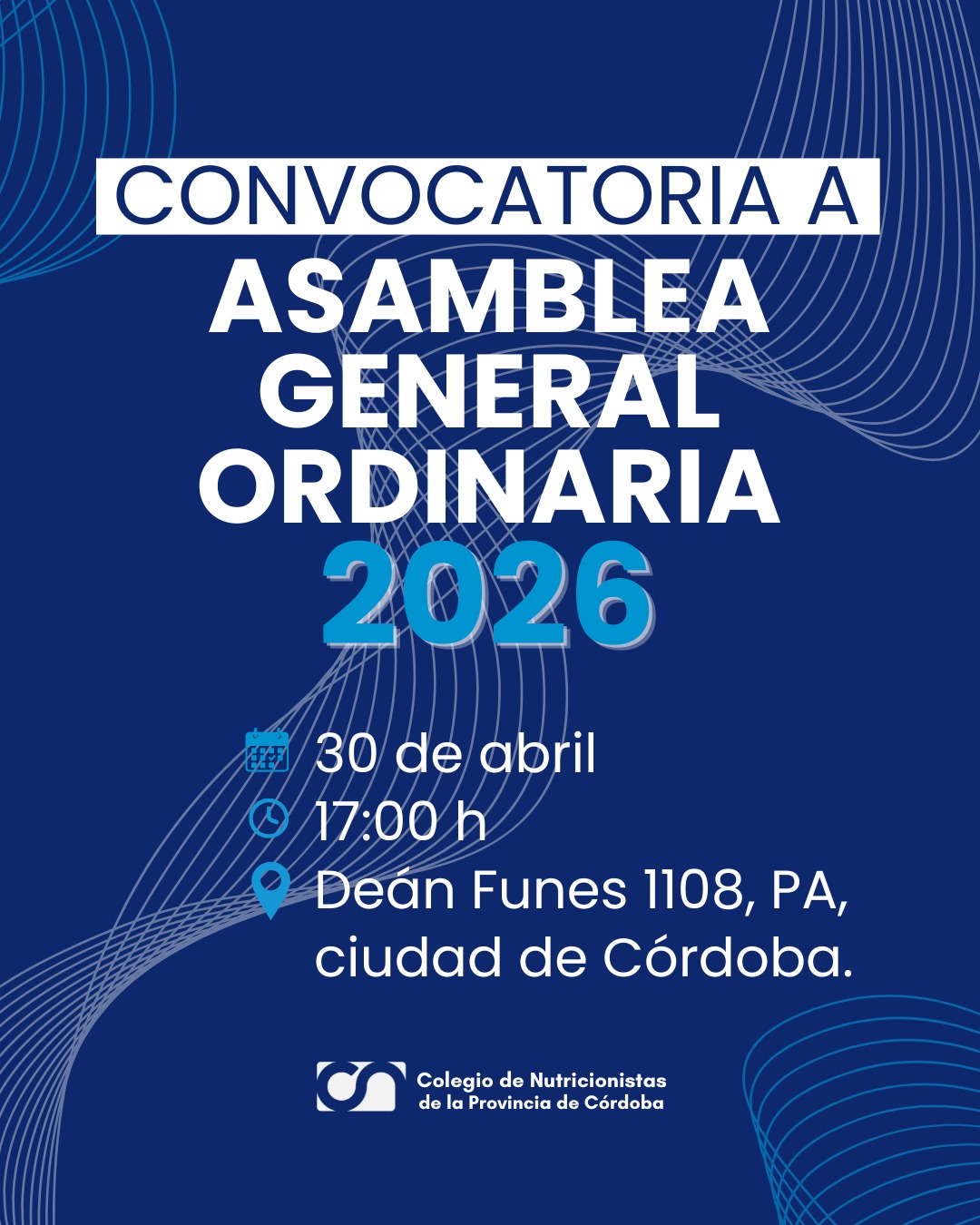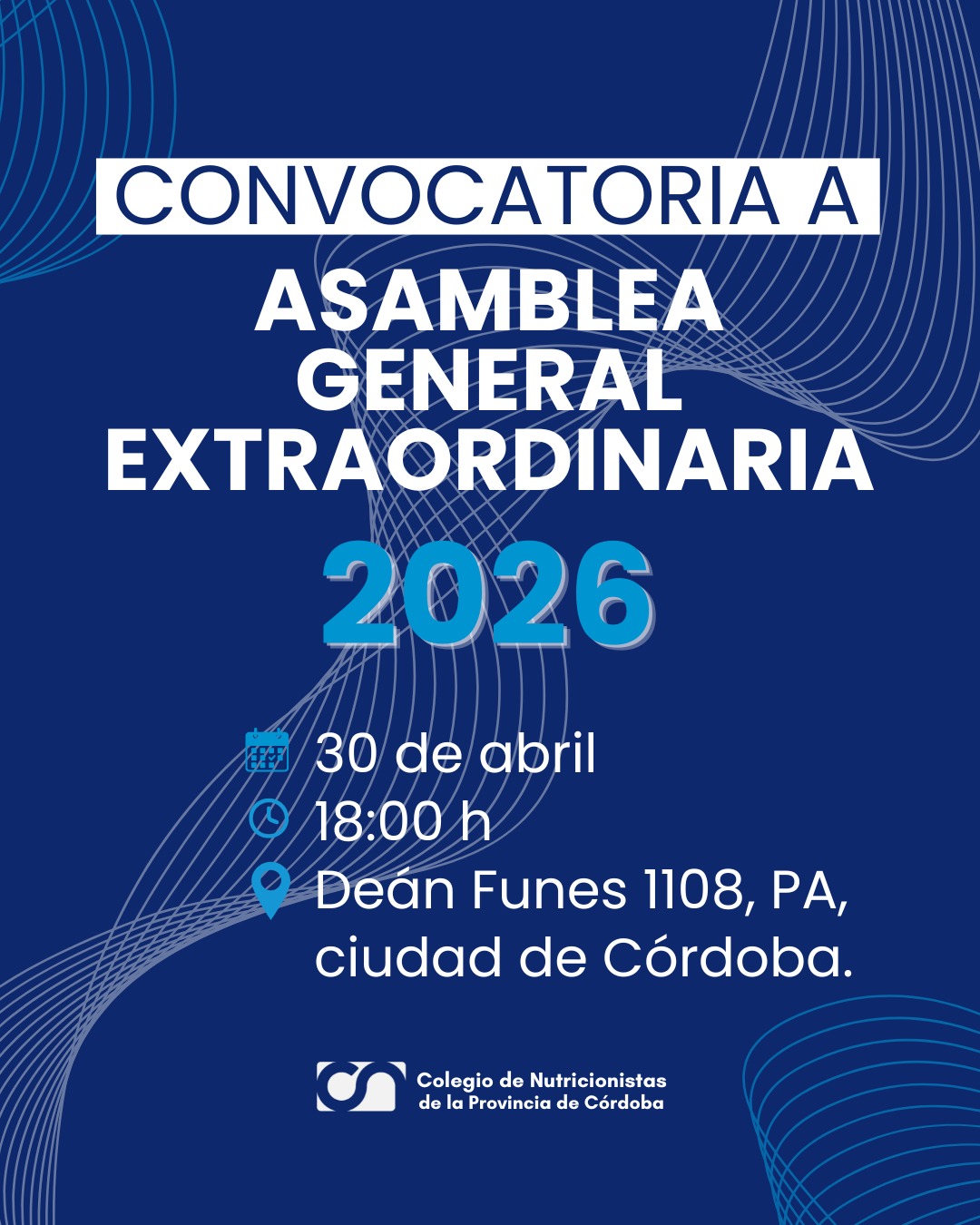 El Colegio de Nutricionistas de la Provincia de Córdoba convoca a Asamblea Extraordinaria a realizarse el día 30 de abril de 2026 …